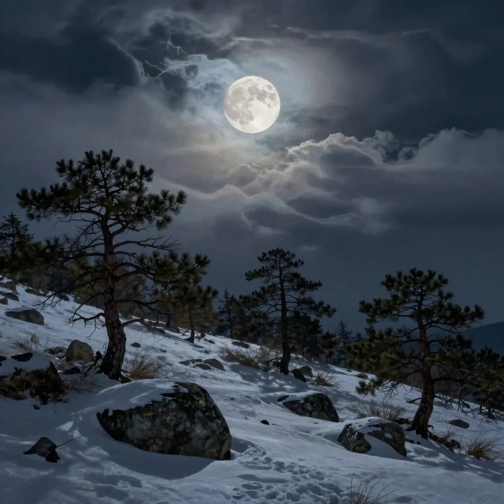 Thick clouds rush under the full moon, half dark and half illuminated for several merely fleeting moments before the darkness swallows them. Leftover snow blankets the rocky hill, melting down to thin white sheets, carefully receding, slowly revealing patches of grass this early spring. One stream of wind runs clean and warm, the other damp and cold. Both caress my skin and I dance happily between the two extremes.
